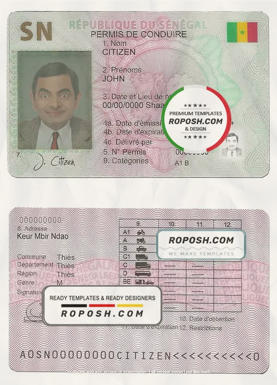 Download the fully editable Senegal Driver’s License PSD Template from our website, Roposh. Customize it with your own information to create a realistic Senegal driver’s license. This template is ideal for creating novelty documents, especially if your ID card is expired, stolen, or unavailable. We also offer a variety of other templates, including passport PSD templates, blank ID card templates, bank statement PSD templates, driver’s license PSD templates, and travel visa psd template.
