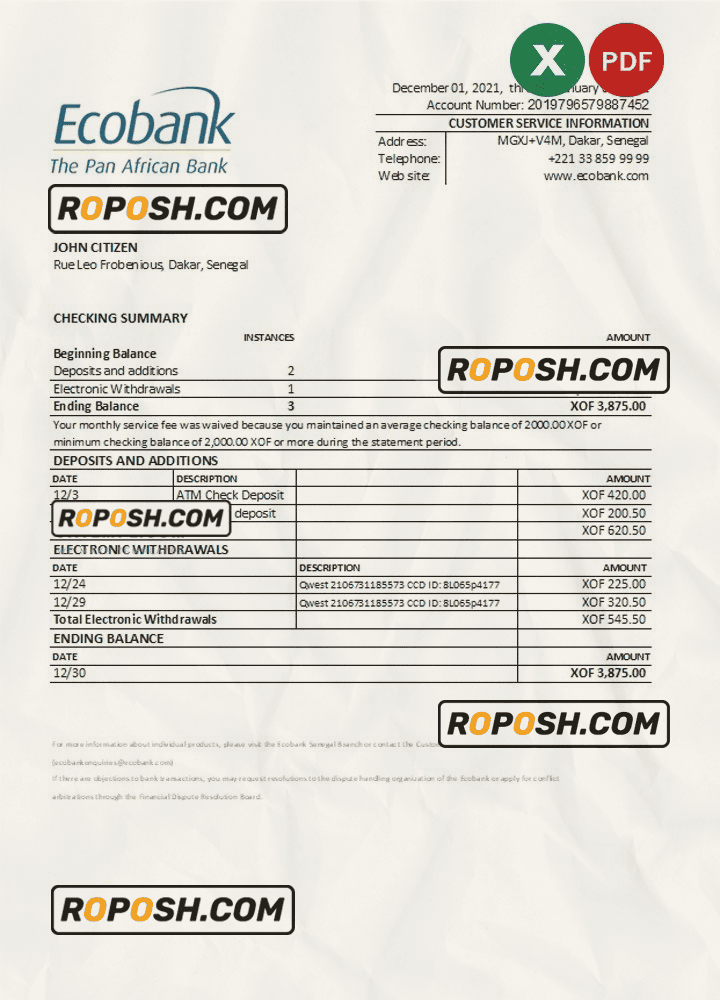 Grab now fully editable Senegal Ecobank bank statement Excel Template from our website Roposh and put your own info to create Realistic Bank Statement template Excel and ready your own novelty documents. It’ll be so beneficial if your Bank Statement is expired, stolen or not available.We also have editable credit card, ID Card psd template, Bank Statement psd template, drivers license psd template & printable editable blank utility bill template.