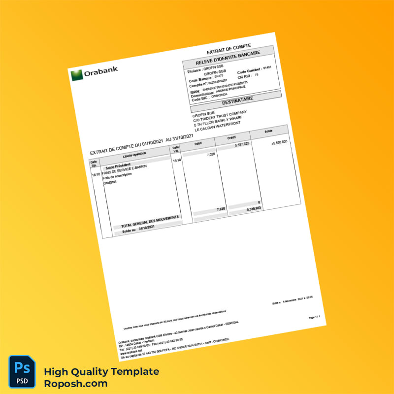 Senegal Orabank Bank Statement Template in Word and PDF Formats