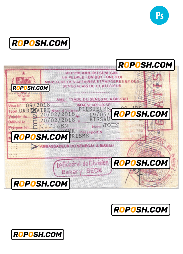 SENEGAL tourist visa stamp template psd. Buy Customizable Travel Visa Template with high quality and enjoy its unique features such as easy to customize, Layer based, fonts included sample. you can edit this template and put any name, address, license number, Id number, birth date, height, weight, expire date, change photos etc. This Photoshop template is a layer based psd file and it’s easy to Editing.To modify this photoshop template file you will need a Photo editing software such as Adobe Photoshop No need to be expert on editing software like adobe Photoshop. However, You just have to basic knowledge on adobe photoshop, to edit this template. Never used low quality template. Your account may be suspended. Also, if you’re looking for an editable SSN template, Roposh is by your side so you can get it easily and even for free.