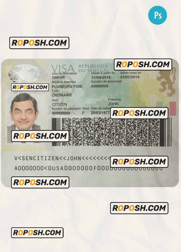 SENEGAL travel visa template psd. Buy Customizable Travel Visa Template with high quality and enjoy its unique features such as easy to customize, Layer based, fonts included sample. you can edit this template and put any name, address, license number, Id number, birth date, height, weight, expire date, change photos etc. This Photoshop template is a layer based psd file and it’s easy to Editing.To modify this photoshop template file you will need a Photo editing software such as Adobe Photoshop No need to be expert on editing software like adobe Photoshop. However, You just have to basic knowledge on adobe photoshop, to edit this template. Never used low quality template. Your account may be suspended. Also, if you’re looking for an editable SSN template, Roposh is by your side so you can get it easily and even for free.