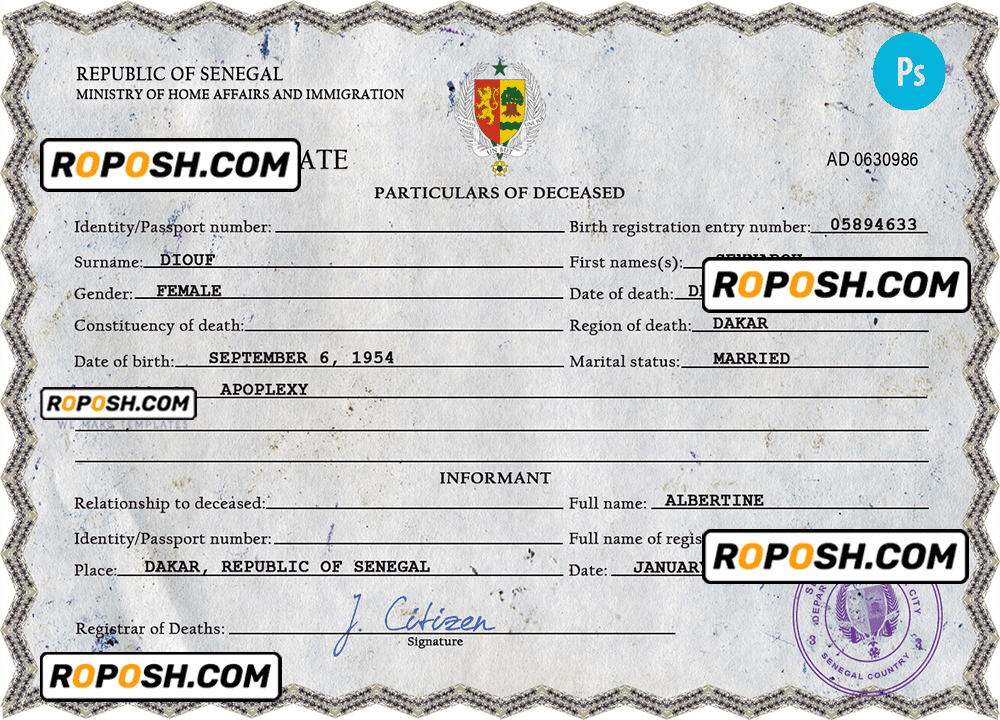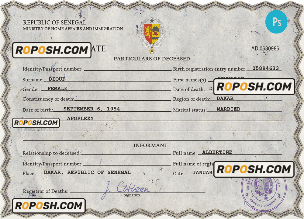 Explore a vast collection of legitimate-looking editable death certificates for several countries worldwide. The editable Senegal death certificates offers easy access to obtaining the required document for a variety of purposes, predominantly claiming life insurance, pensions, and resolving estates.