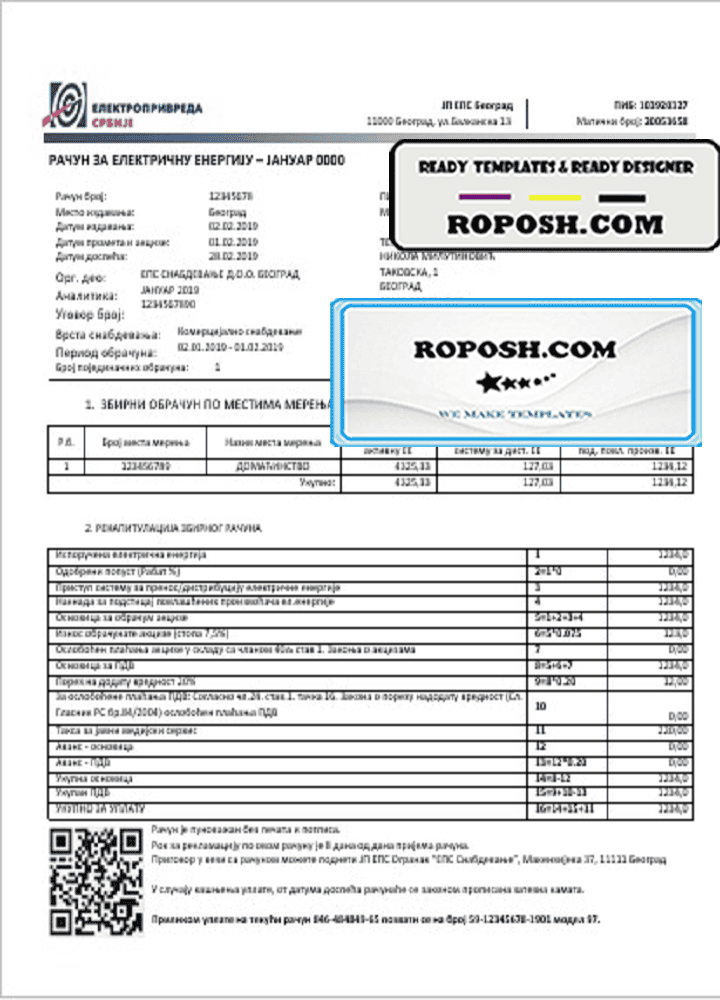 Serbia Електропривреда Србиjе electricity utility bill template in Word and PDF format