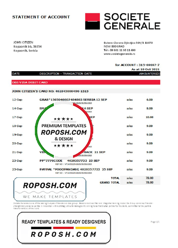 Grab now fully editable Serbia Societe Generale bank statement easy to fill Excel Template from our website Roposh and put your own info to create Realistic Bank Statement template Excel and ready your own novelty documents. It’ll be so beneficial if your Bank Statement is expired, stolen or not available.We also have editable credit card, ID Card psd template, Bank Statement psd template, drivers license psd template & printable editable blank utility bill template.