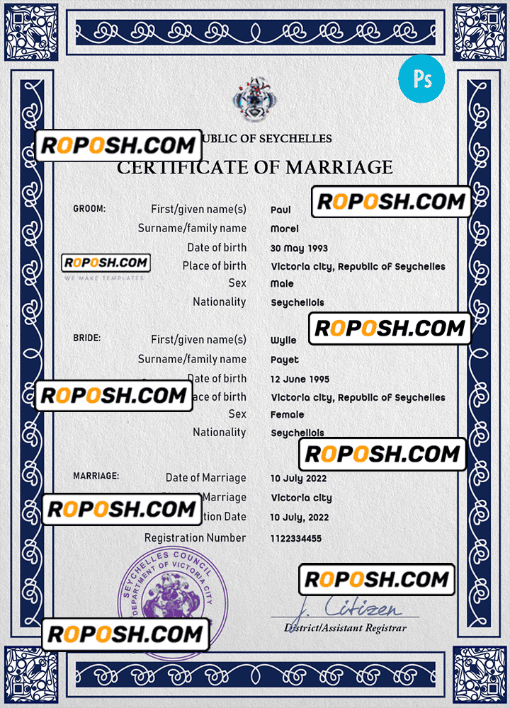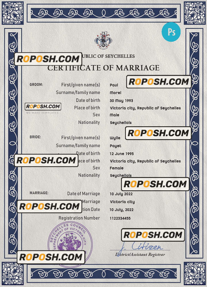 Seychelles marriage certificate PSD template, completely editable