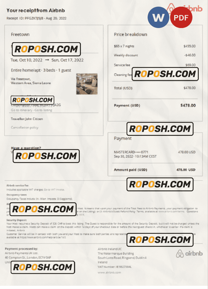 This Blank Sierra Leone Airbnb booking confirmation PDF Template is perfect for a variety of uses, such as Visa applications, proof of accommodation, showing your expenses, and more. You can even use it to create realistic copies of your credit card for novelty documents. We have a variety of other templates available, including passport templates, ID card templates, reciept template, and more.