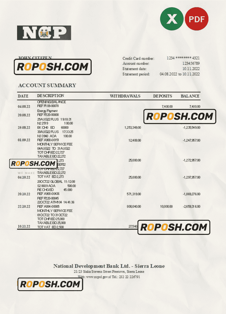 Sierra Leone National Development bank statement, Excel and PDF template