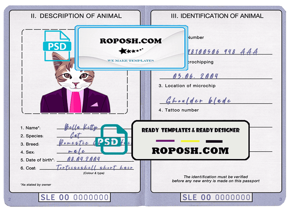 We understand that international travel with pets can be a daunting task, and obtaining a real pet passport can be time-consuming and expensive. That’s why we offer a convenient, cost-effective solution with our editable editable passports. Our templates are available in both PSD and Word formats, making them easy to edit and customize to your pet’s unique details.