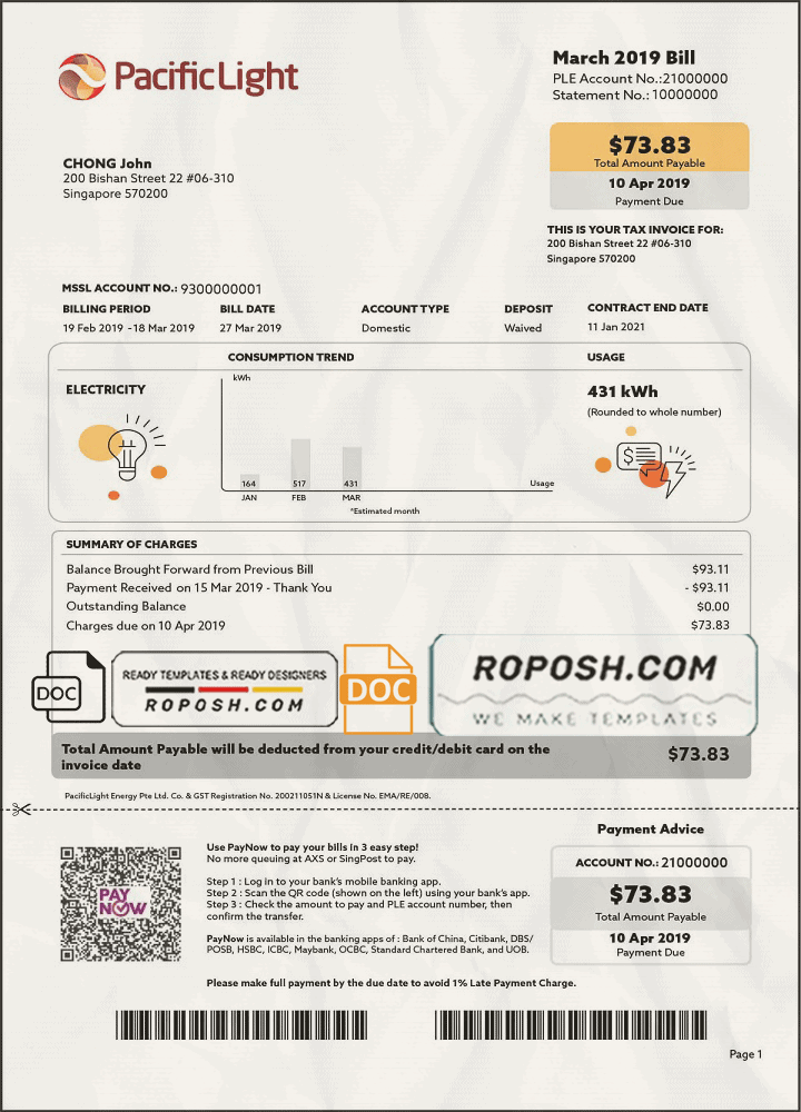 Singapore Pacific Light electricity utility bill template in Word and PDF format