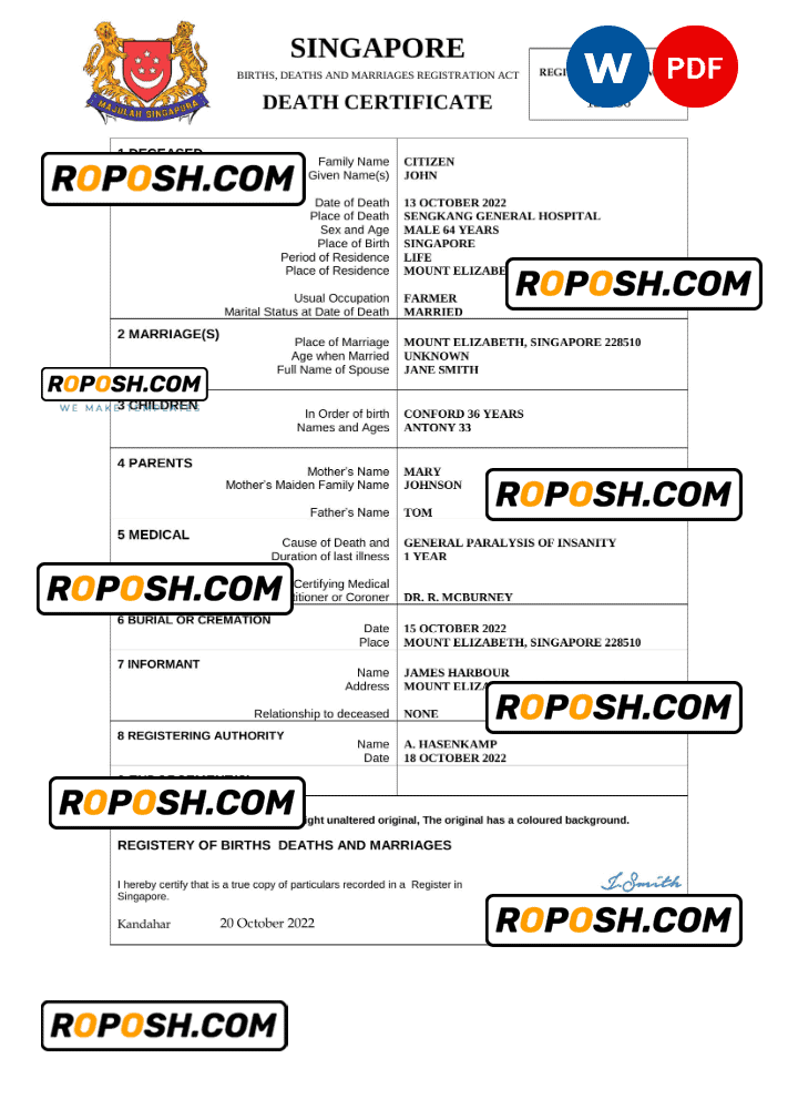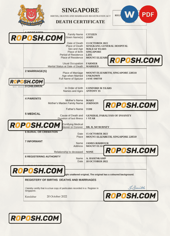 Explore a vast collection of legitimate-looking editable death certificates for several countries worldwide. The editable Singapore death certificates offers easy access to obtaining the required document for a variety of purposes, predominantly claiming life insurance, pensions, and resolving estates.
