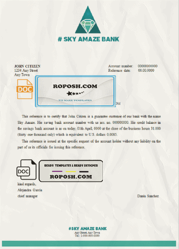 Grab now fully editable sky amaze bank universal multipurpose bank account reference Word Template from our website Roposh and put your own info to create Realistic Bank Statement Word template and ready your own novelty documents. It’ll be so beneficial if your Bank Statement is expired, stolen or not available. We also have passport psd template, ID Card psd template, Bank Statement psd template, drivers license psd template & Utility bill psd template