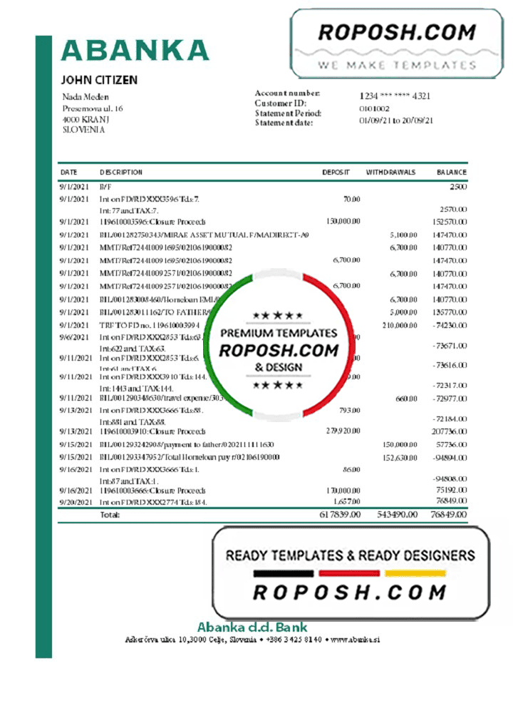 Grab now fully editable Slovenia Abanka d.d bank statement Excel Template from our website Roposh and put your own info to create Realistic Bank Statement template Excel and ready your own novelty documents. It’ll be so beneficial if your Bank Statement is expired, stolen or not available.We also have editable credit card, ID Card psd template, Bank Statement psd template, drivers license psd template & printable editable blank utility bill template.