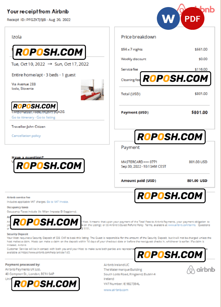 This Blank Slovenia Airbnb booking confirmation PDF Template is perfect for a variety of uses, such as Visa applications, proof of accommodation, showing your expenses, and more. You can even use it to create realistic copies of your credit card for novelty documents. We have a variety of other templates available, including passport templates, ID card templates, reciept template, and more.