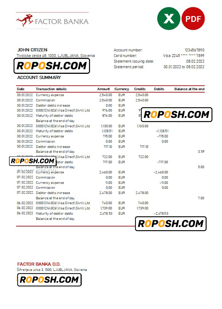 Slovenia Factor Banka bank statement Template in Excel an PDF format use for :