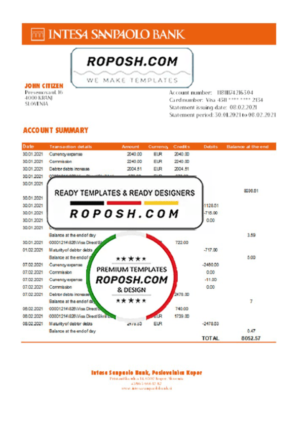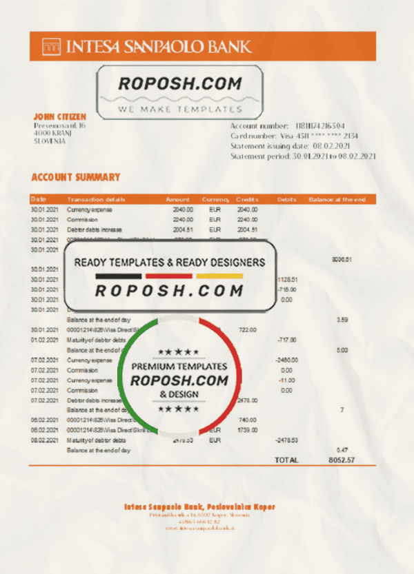 Grab now fully editable Slovenia Intesa Sanpaolo Bank, Poslovalnica Koper bank statement easy to fill Excel Template from our website Roposh and put your own info to create Realistic Bank Statement template Excel and ready your own novelty documents. It’ll be so beneficial if your Bank Statement is expired, stolen or not available.We also have editable credit card, ID Card psd template, Bank Statement psd template, drivers license psd template & printable editable blank utility bill template.