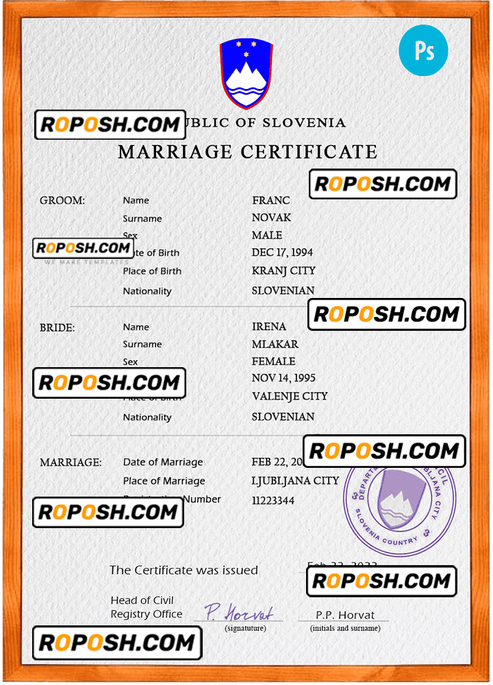 Slovenia marriage certificate PSD template, completely editable