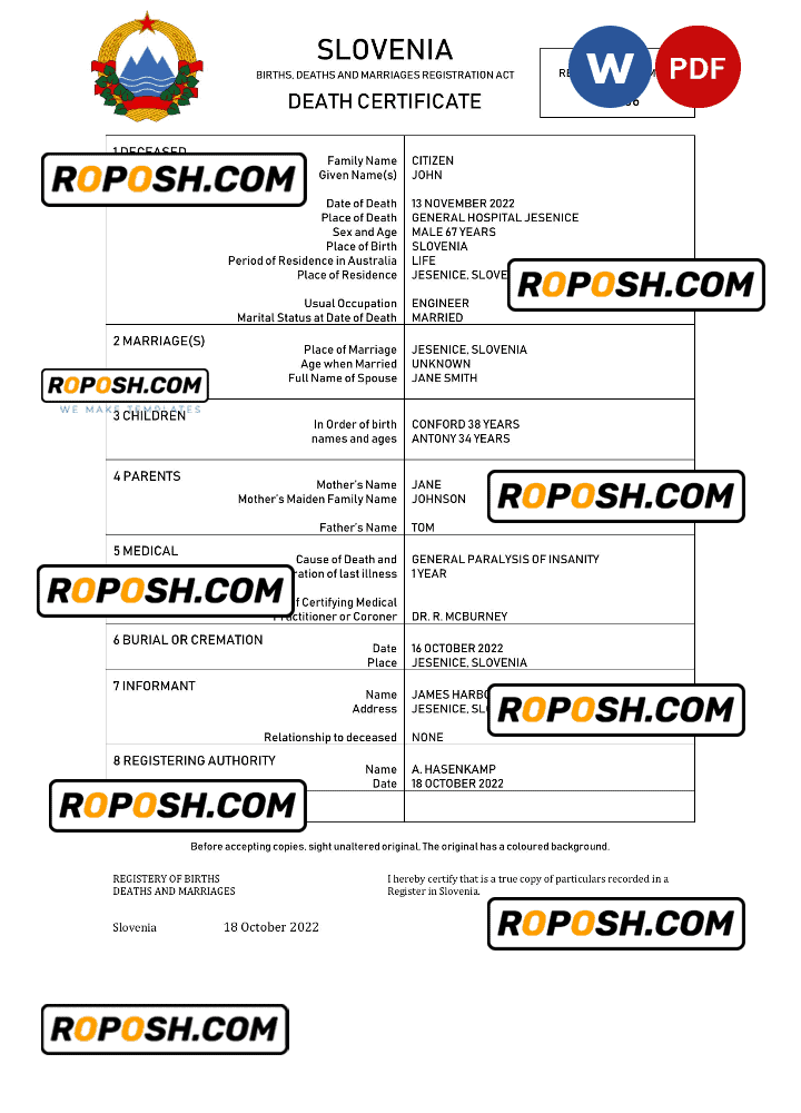 Explore a vast collection of legitimate-looking editable death certificates for several countries worldwide. The editable Slovenia death certificates offers easy access to obtaining the required document for a variety of purposes, predominantly claiming life insurance, pensions, and resolving estates.