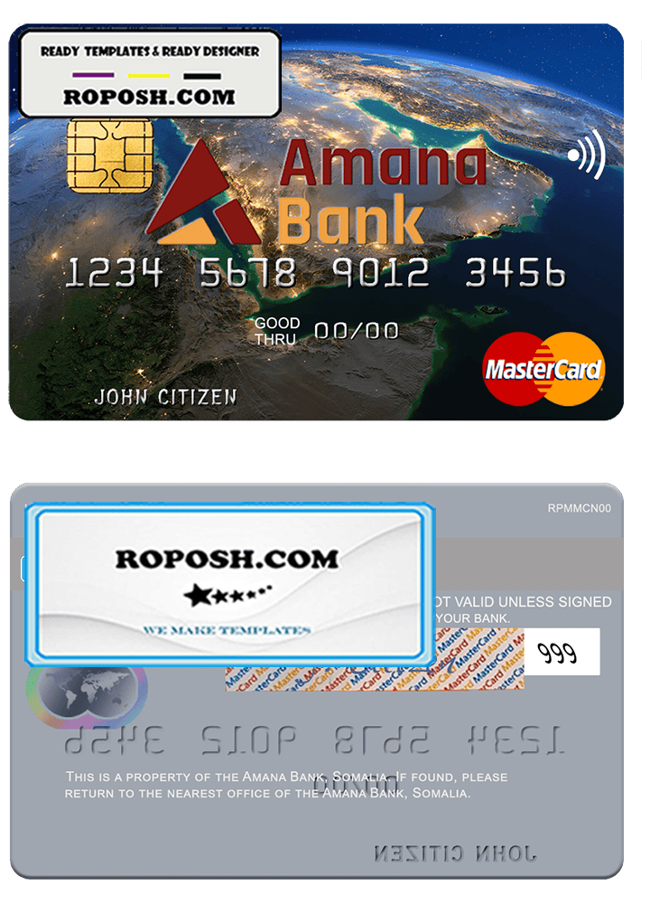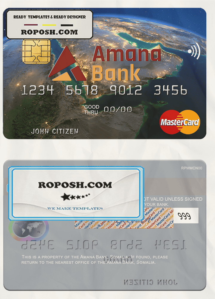 This Somalia Amana Bank mastercard credit card PSD Template is perfect for a variety of uses, such as removing PayPal account limitations, verifying Facebook accounts, and more. You can even use it to create copies of your credit card for novelty documents. We have a variety of other templates available, including passport templates, ID card templates, bank statement templates, and more.