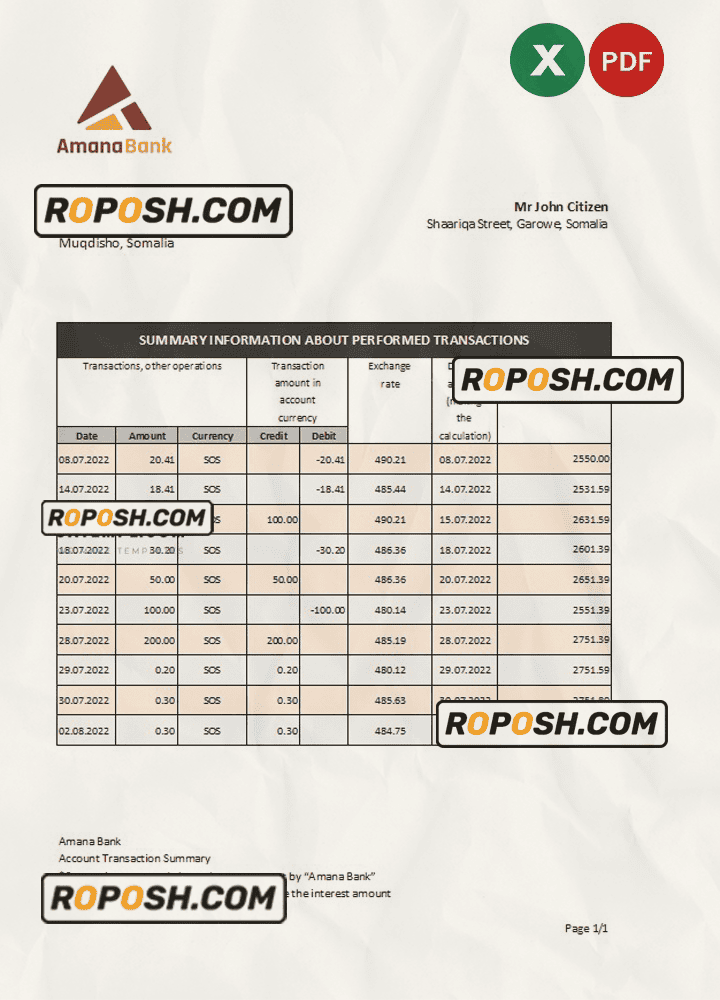 Grab now fully editable Somalia Amana bank statement Excel Template from our website Roposh and put your own info to create Realistic Bank Statement template Excel and ready your own novelty documents. It’ll be so beneficial if your Bank Statement is expired, stolen or not available.We also have editable credit card, ID Card psd template, Bank Statement psd template, drivers license psd template & printable editable blank utility bill template.