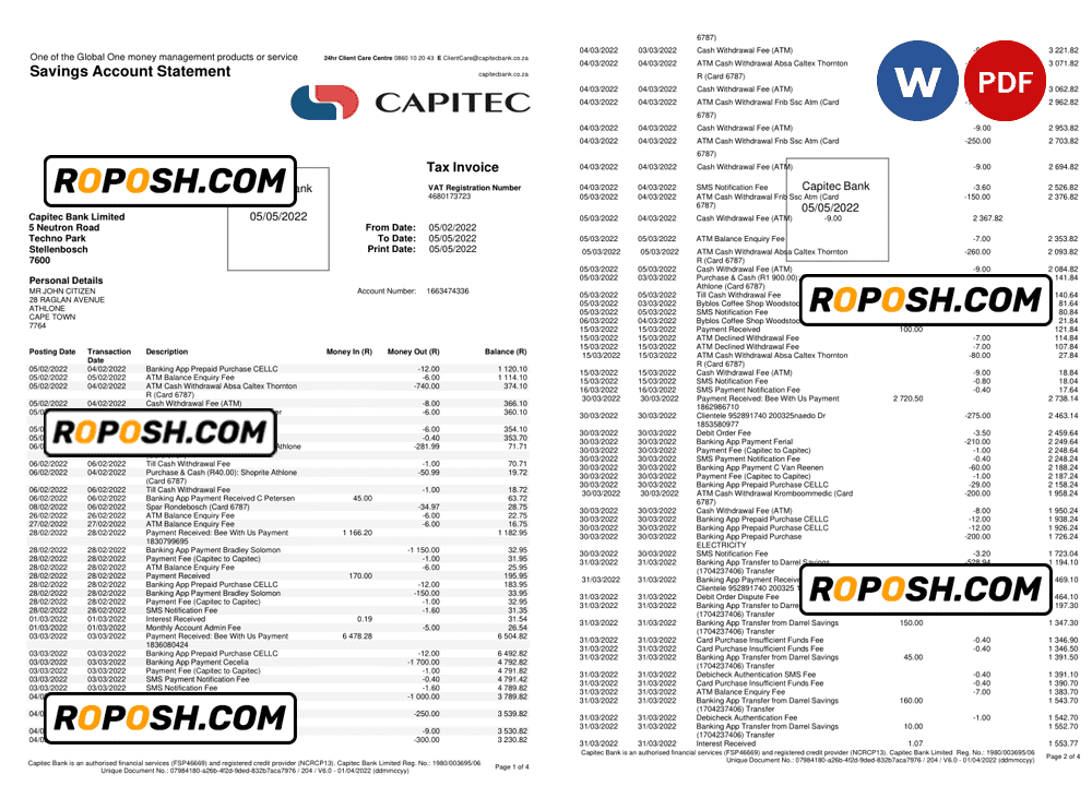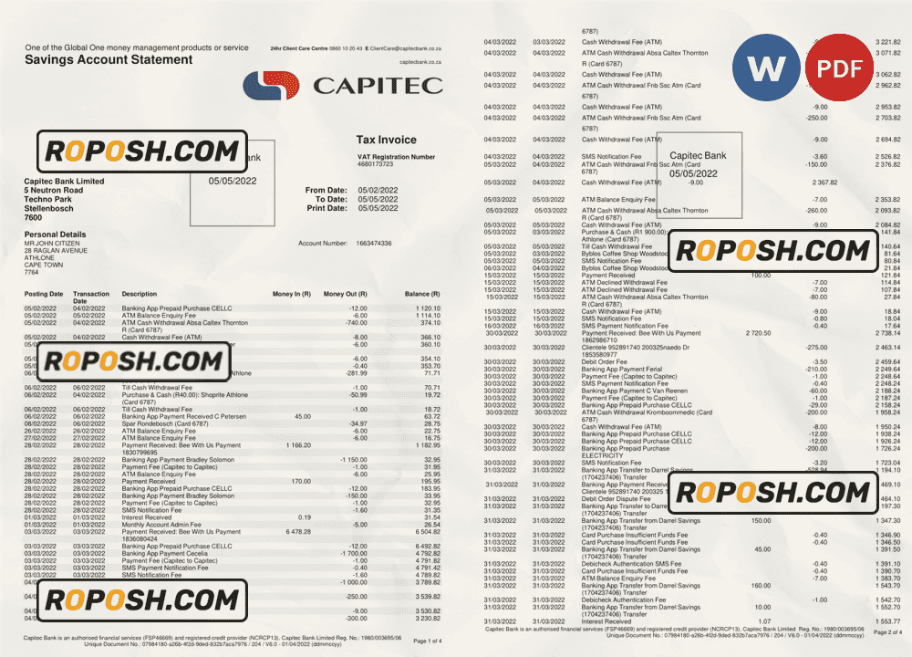 Get your fully editable South Africa Capitec Bank Savings Account Statement Template from Roposh today. Customize it with your information to create a realistic bank statement for educational or theatrical purposes. This template is perfect if your bank statement is expired, stolen, or unavailable. We also offer editable credit card templates, ID card templates, bank statement PSD templates, driver’s license PSD templates, and printable editable blank utility bill templates.