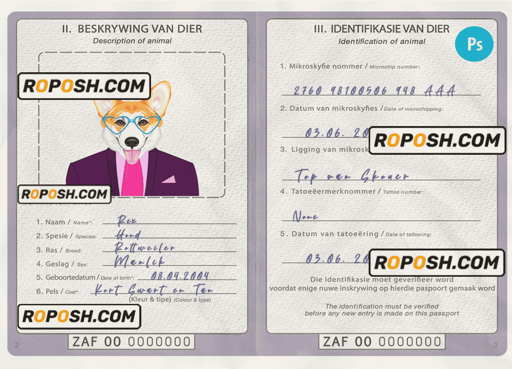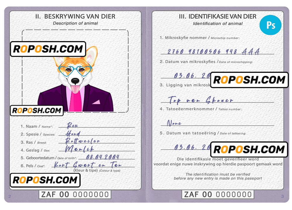 South Africa dog (animal, pet) passport PSD template, is your one-stop-shop for realistic and editable editable pet identity cards and passports. We specialize in creating high-quality, customizable editable pet passports and identity cards for dogs, cats, and other furry friends.