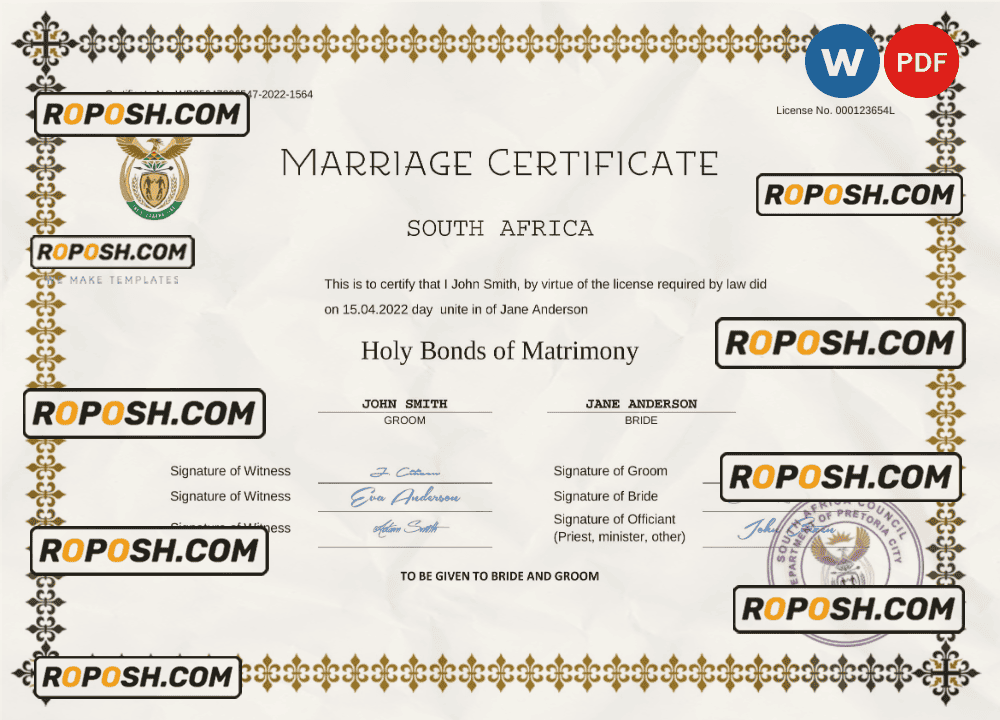 Be the first to review “South Africa marriage certificate Word and PDF template, completely editable”