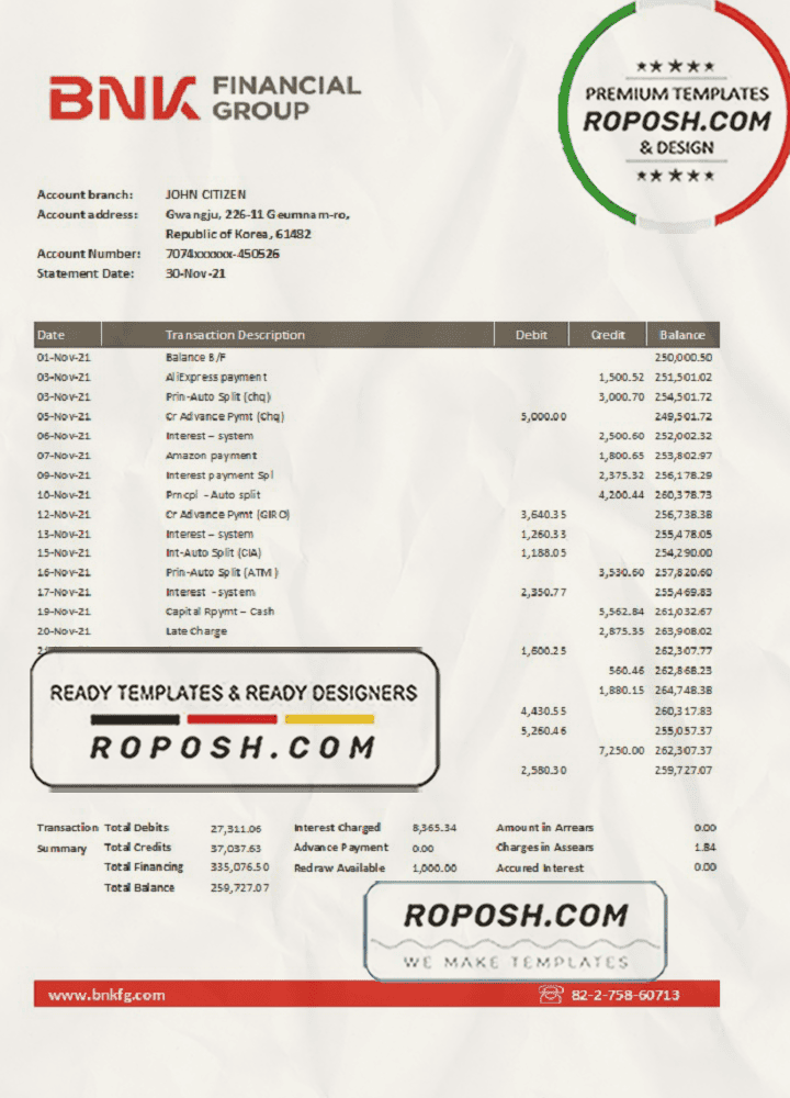 Grab now fully editable South Korea BNK bank statement easy to fill Excel Template from our website Roposh and put your own info to create Realistic Bank Statement template Excel and ready your own novelty documents. It’ll be so beneficial if your Bank Statement is expired, stolen or not available.We also have editable credit card, ID Card psd template, Bank Statement psd template, drivers license psd template & printable editable blank utility bill template.