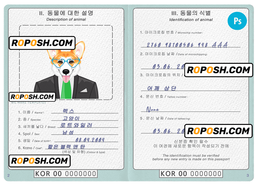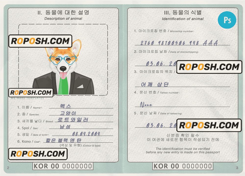 South Korea dog (animal, pet) passport PSD template, is your one-stop-shop for realistic and editable editable pet identity cards and passports. We specialize in creating high-quality, customizable editable pet passports and identity cards for dogs, cats, and other furry friends.