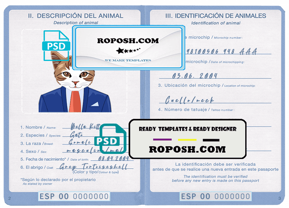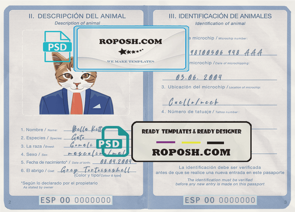 Spain cat (animal, pet) passport PSD template, is designed to look and feel like real documents. Each template is carefully crafted to include all the necessary details, such as your pet’s name, breed, date of birth, and microchip information. With our fillable cat or dog passport templates, you can quickly and easily create a editable pet passport that meets all the requirements for international travel.