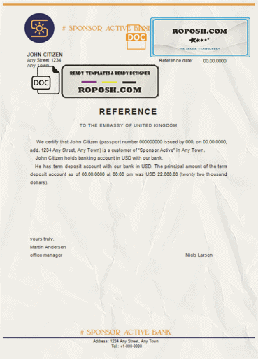sponsor active bank universal multipurpose offer high-quality customizable bank reference form template in PSD and Word format, allowing you to easily fill in your personal details and make them look authentic. Our templates are perfect for online account verification, research, presentation, or work.