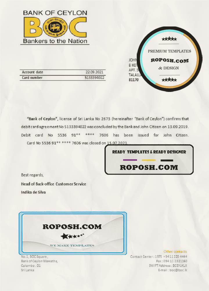 Sri Lanka BOC bank account closure reference letter template in Word and PDF format offer high-quality customizable bank reference form template in PSD and Word format, allowing you to easily fill in your personal details and make them look authentic. Our templates are perfect for online account verification, research, presentation, or work.