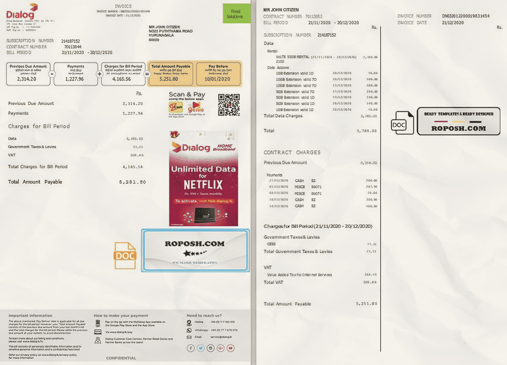 Get your blank Sri Lanka Dialog utility bill template from Roposh now. Customize it with your information to create a copy for proof of address. Ideal for situations where your utility bill is expired, stolen, or unavailable. We also offer a variety of other templates, including passport PSD templates, ID card PSD templates, bank statement PSD templates, driver’s license PSD templates, and utility bill PSD templates.