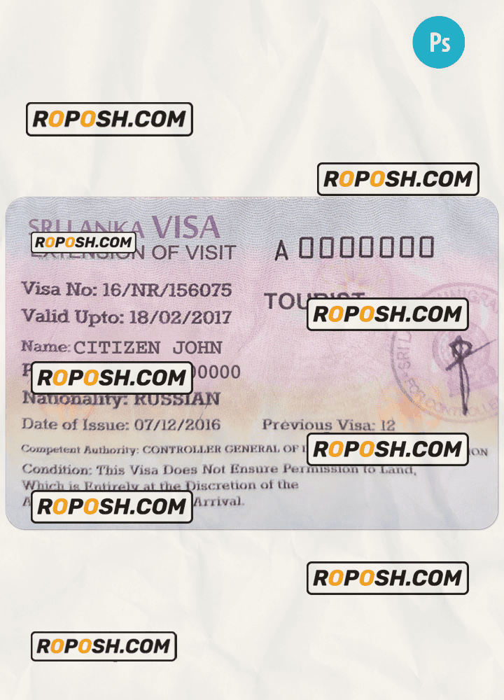Sri Lanka tourist visa template psd. Buy Customizable Travel Visa Template with high quality and enjoy its unique features such as easy to customize, Layer based, fonts included sample. you can edit this template and put any name, address, license number, Id number, birth date, height, weight, expire date, change photos etc. This Photoshop template is a layer based psd file and it’s easy to Editing.To modify this photoshop template file you will need a Photo editing software such as Adobe Photoshop No need to be expert on editing software like adobe Photoshop. However, You just have to basic knowledge on adobe photoshop, to edit this template. Never used low quality template. Your account may be suspended. Also, if you’re looking for an editable SSN template, Roposh is by your side so you can get it easily and even for free.