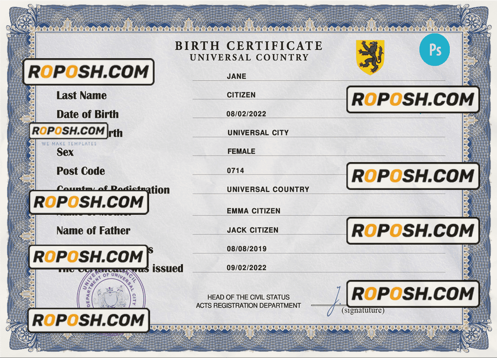 roposh offers hundreds of high-quality, realistic, and customizable birth certificates. The stance universal birth certificate template is fully fillable, and you can complete it with any information you wish, such as name, surname, birth date, place of birth and etc. Whether you are using our PSD template (a layer-based adobe photoshop file) or our PDF template (a Microsoft Office editable file) you will get a package with fonts included instantly. No need to worry even if you can’t generate realistic birth proof yourself, we offer reliable editing service with your desired information for an extra charge. Also, we are always online and here to help you experience a confident purchase. So, reach out!