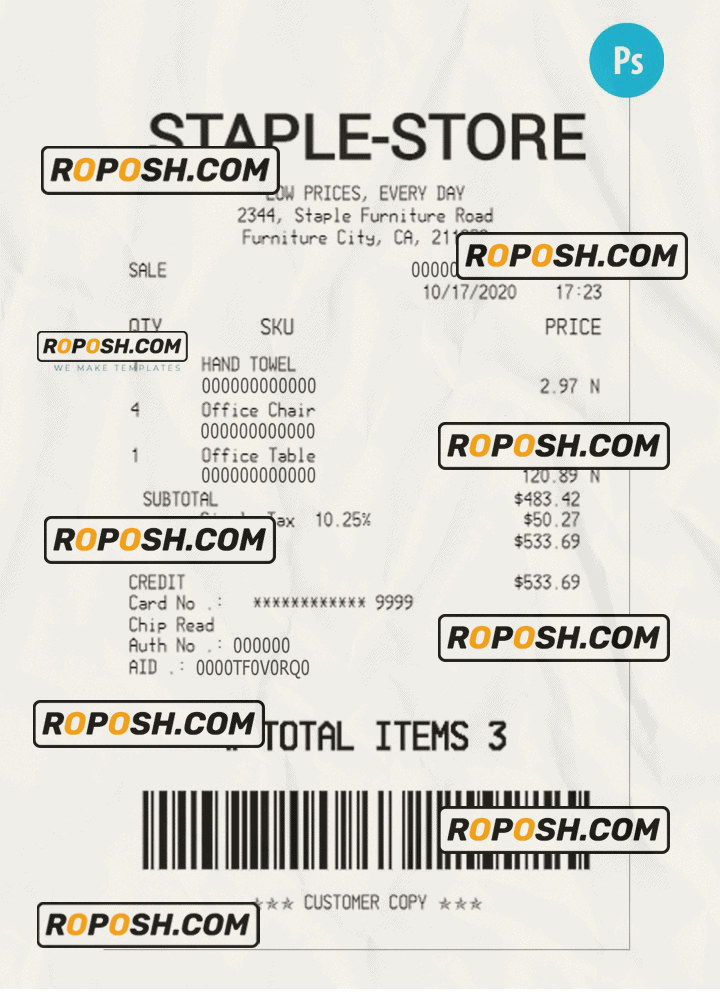 Blank STAPLE-STORE Receipt PSD Template :