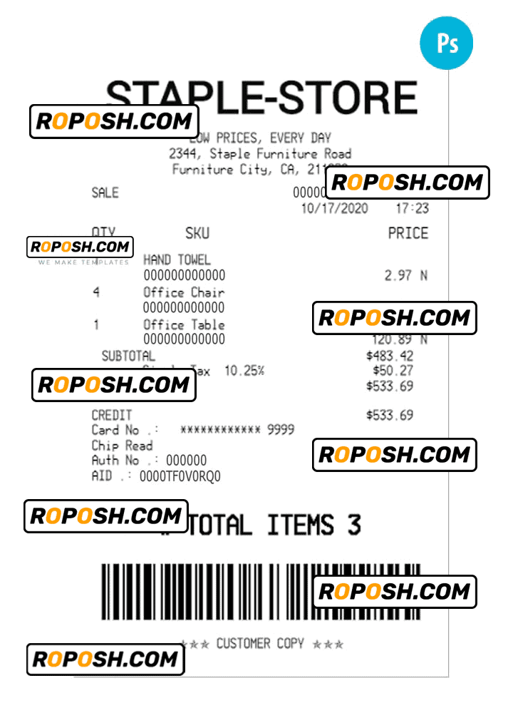A collection of STAPLE-STORE payment receipt samples can act as proof that a transaction has been successfully completed; for your convenience, editable payments templates options come in various formats, including Word, Excel, PDF, PSD, Docs and Google Sheets. We provide store receipts’ templates for different types of usages, such as sales, rent, pharmacy, food, and donation receipts from renown markets, services, and shops. Our goal is to offer you reliable and professional design pay editable options that help you manage your finances gals.