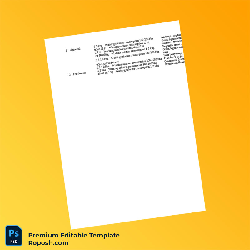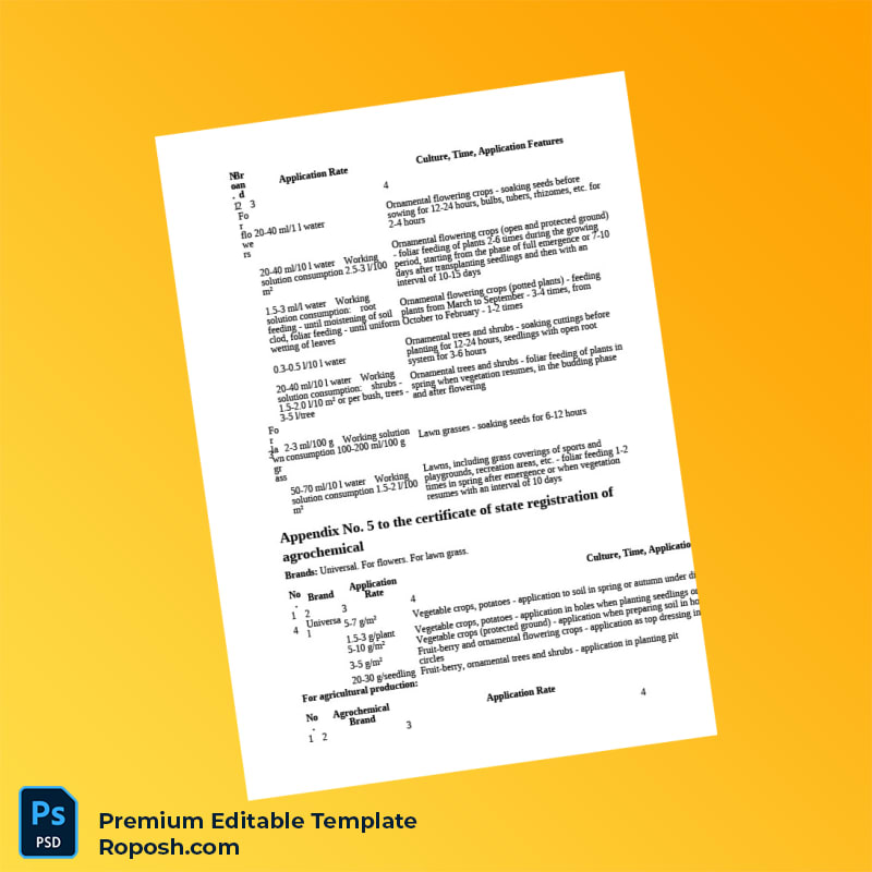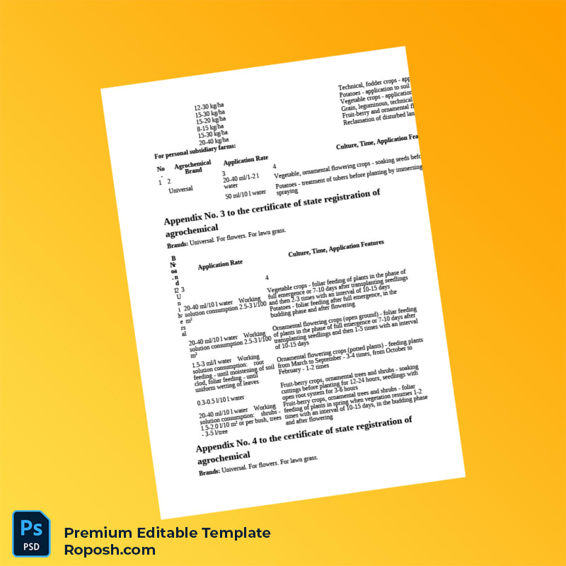 Don’t let administrative difficulties impede your agrochemical business growth. Invest in this flexible and professionally crafted State Registration Certificate for Humic Acids Agrochemical in Word and PDF formatsEditable Word & PDF Template now and enjoy streamlined compliance management. Purchase with confidence and gain full control over your vital registration documentation.