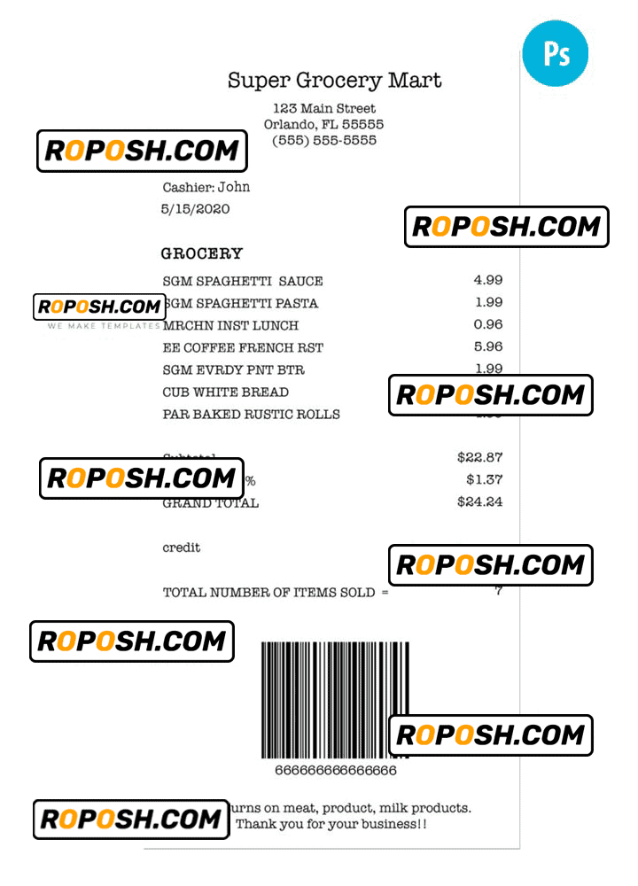 Features Editable SUPER GROCERY MART Receipt PSD Template :