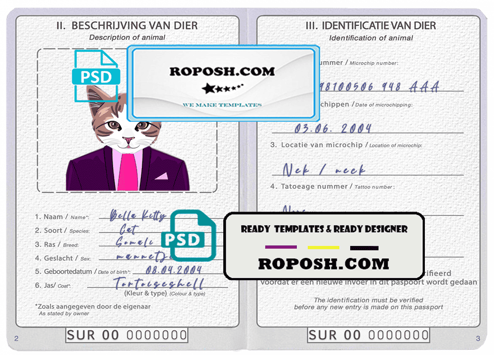Suriname cat (animal, pet) passport PSD template, is designed to look and feel like real documents. Each template is carefully crafted to include all the necessary details, such as your pet’s name, breed, date of birth, and microchip information. With our fillable cat or dog passport templates, you can quickly and easily create a editable pet passport that meets all the requirements for international travel.