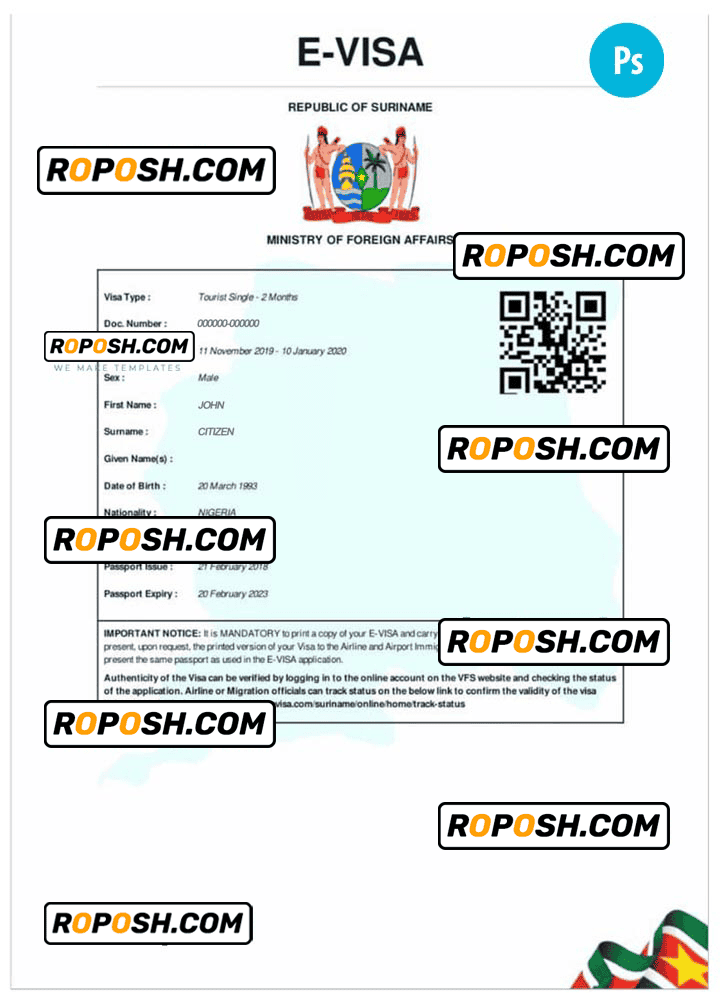 Grab now fully editable SURINAME electronic travel visa Psd Template from our website roposh and put your own info to create a copy of SURINAME electronic travel visa psd template and ready your own novelty documents. It’ll be so beneficial if your ID Card is expired, stolen or not available. We also have blank invoice template, ID Card psd template, Bank Statement psd template, drivers license psd template & utility bill psd template.