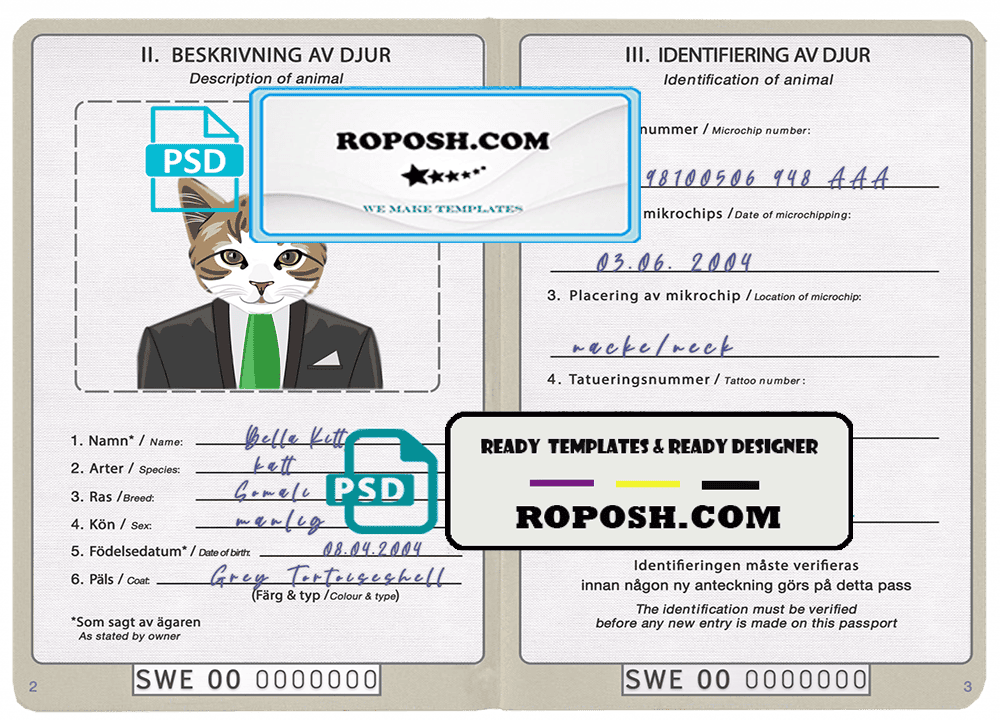 Sweden cat (animal, pet) passport PSD template, is designed to look and feel like real documents. Each template is carefully crafted to include all the necessary details, such as your pet’s name, breed, date of birth, and microchip information. With our fillable cat or dog passport templates, you can quickly and easily create a editable pet passport that meets all the requirements for international travel.