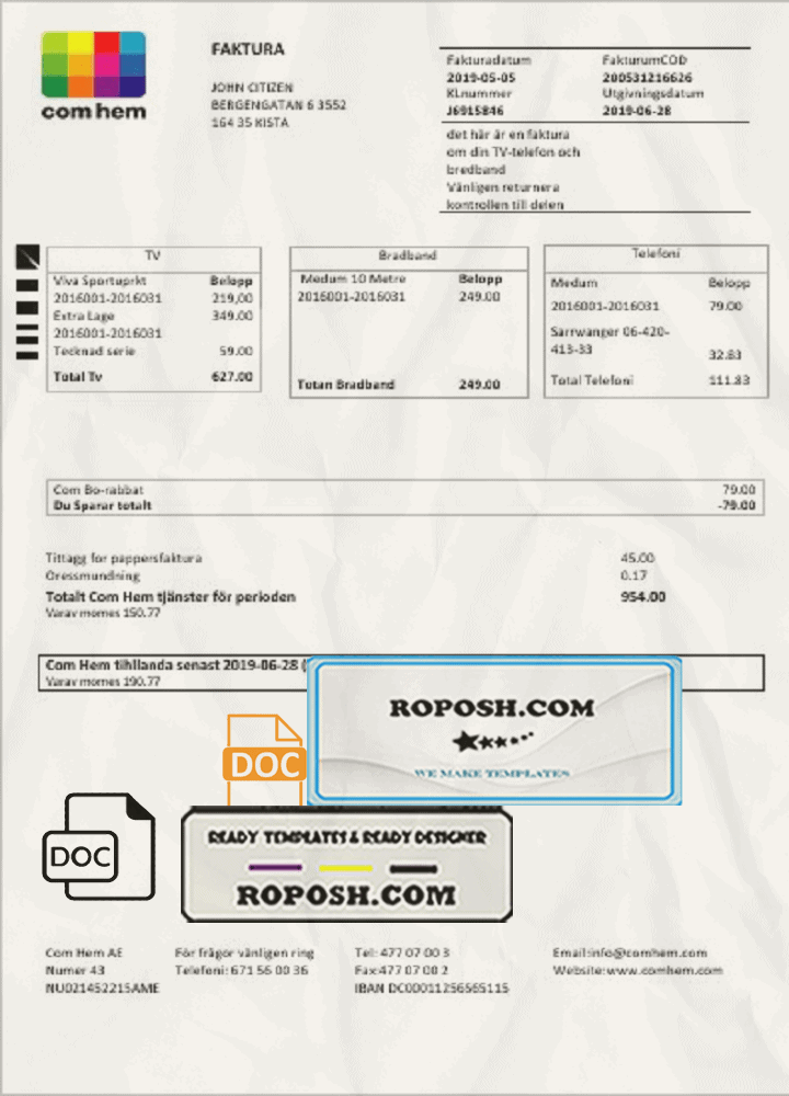 Sweden Com Hem Utility Bill Template – Editable Word Format