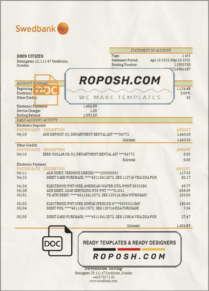 Grab now fully editable Sweden Swedbank bank statement Word Template from our website Roposh and put your own info to create Realistic Bank Statement Word template and ready your own novelty documents. It’ll be so beneficial if your Bank Statement is expired, stolen or not available.We also have editable credit card, ID Card psd template, Bank Statement psd template, drivers license psd template & printable editable blank utility bill template.