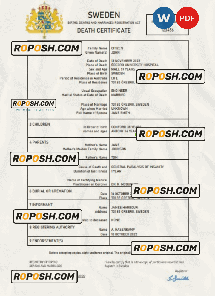 Sweden vital record death certificate Word and PDF template