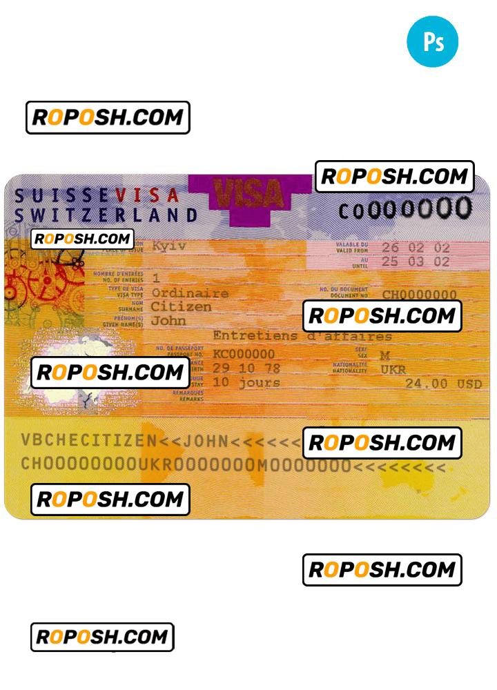 Switzerland travel visa template psd. Buy Customizable Travel Visa Template with high quality and enjoy its unique features such as easy to customize, Layer based, fonts included sample. you can edit this template and put any name, address, license number, Id number, birth date, height, weight, expire date, change photos etc. This Photoshop template is a layer based psd file and it’s easy to Editing.To modify this photoshop template file you will need a Photo editing software such as Adobe Photoshop No need to be expert on editing software like adobe Photoshop. However, You just have to basic knowledge on adobe photoshop, to edit this template. Never used low quality template. Your account may be suspended. Also, if you’re looking for an editable SSN template, Roposh is by your side so you can get it easily and even for free.