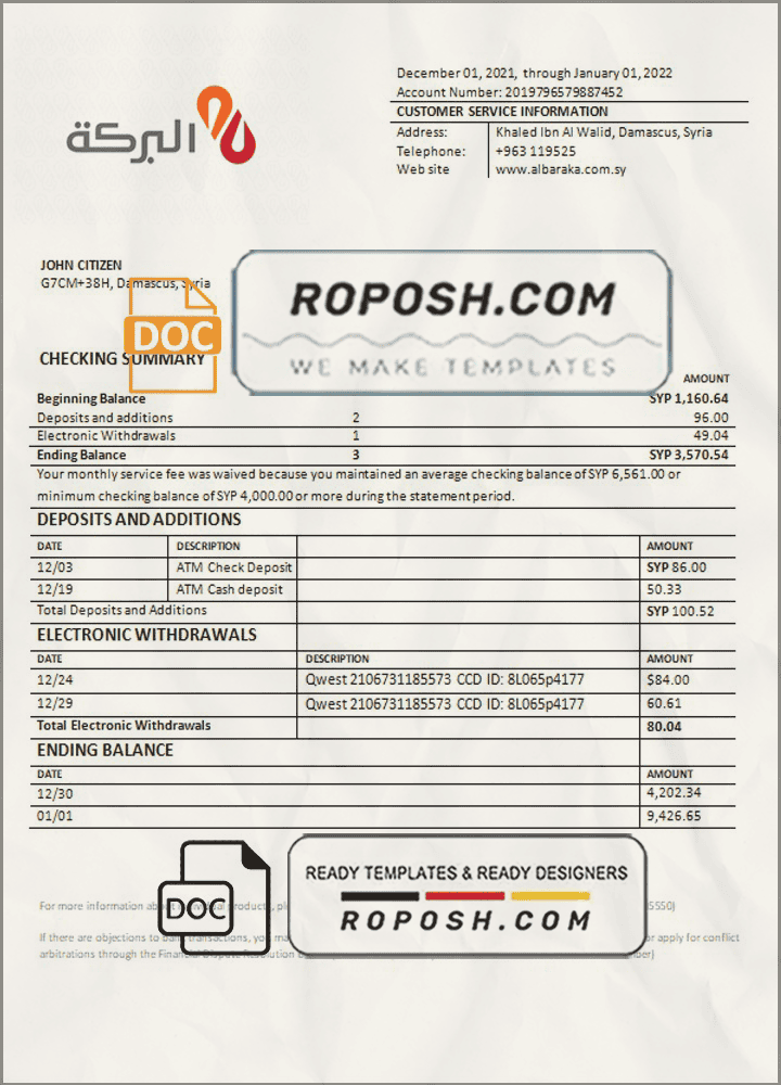 Get your fully editable Syria Al Baraka bank statement Word Template from Roposh and customize it with your own information to create a realistic bank statement. This is especially useful if your bank statement is expired, stolen, or unavailable. We also offer editable credit card templates, ID card PSD templates, bank statement PSD templates, driver’s license PSD templates, and printable editable blank utility bill templates.
