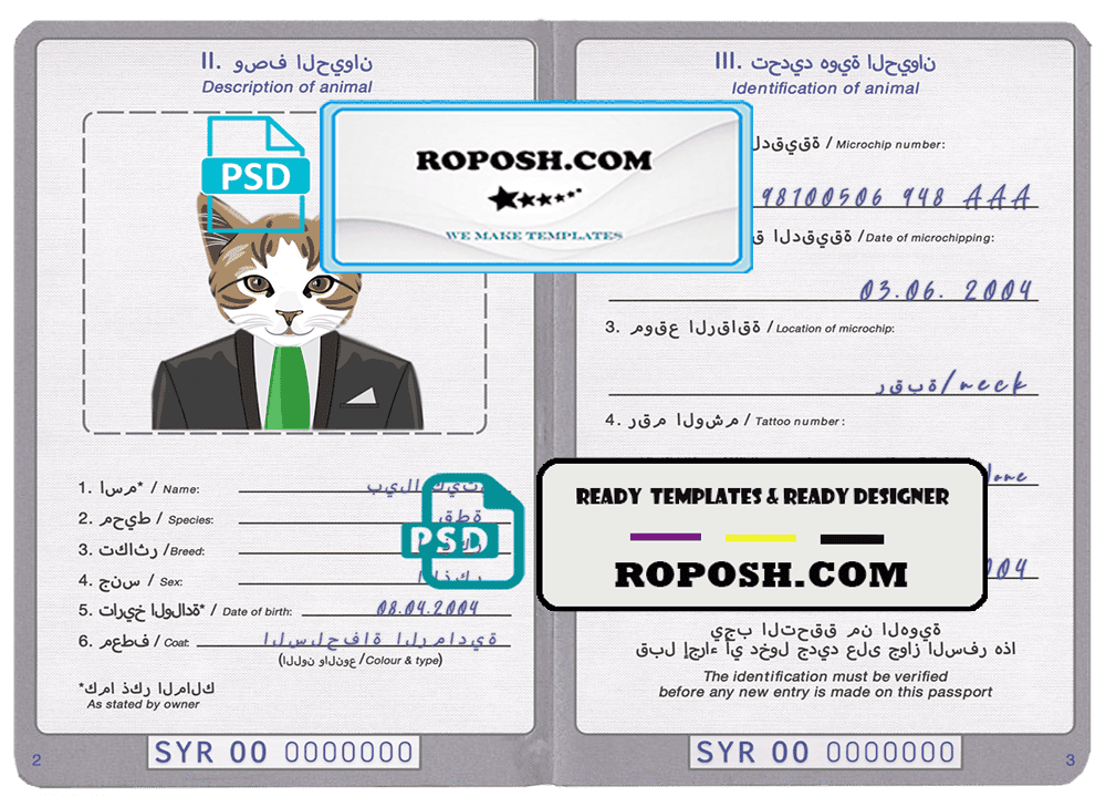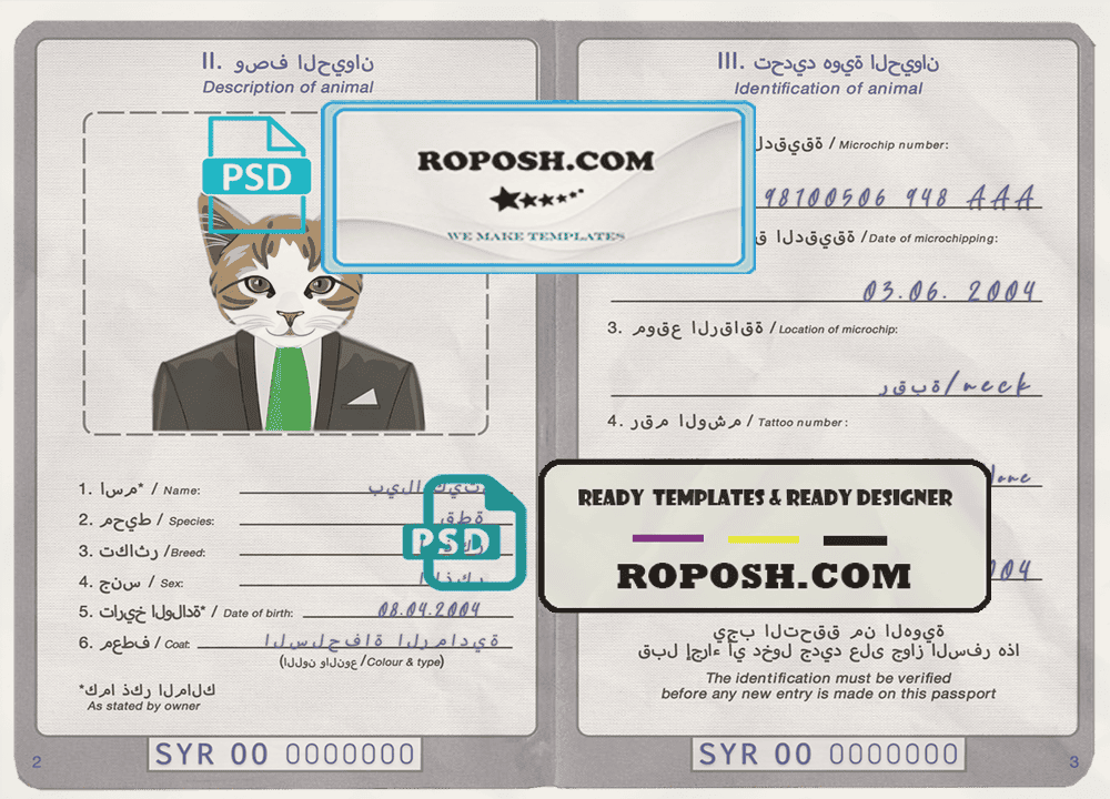 Syria cat (animal, pet) passport PSD template, is designed to look and feel like real documents. Each template is carefully crafted to include all the necessary details, such as your pet’s name, breed, date of birth, and microchip information. With our fillable cat or dog passport templates, you can quickly and easily create a editable pet passport that meets all the requirements for international travel.
