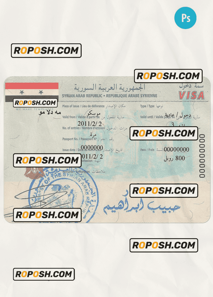 SYRIA travel visa template psd. Buy Customizable Travel Visa Template with high quality and enjoy its unique features such as easy to customize, Layer based, fonts included sample. you can edit this template and put any name, address, license number, Id number, birth date, height, weight, expire date, change photos etc. This Photoshop template is a layer based psd file and it’s easy to Editing.To modify this photoshop template file you will need a Photo editing software such as Adobe Photoshop No need to be expert on editing software like adobe Photoshop. However, You just have to basic knowledge on adobe photoshop, to edit this template. Never used low quality template. Your account may be suspended. Also, if you’re looking for an editable SSN template, Roposh is by your side so you can get it easily and even for free.
