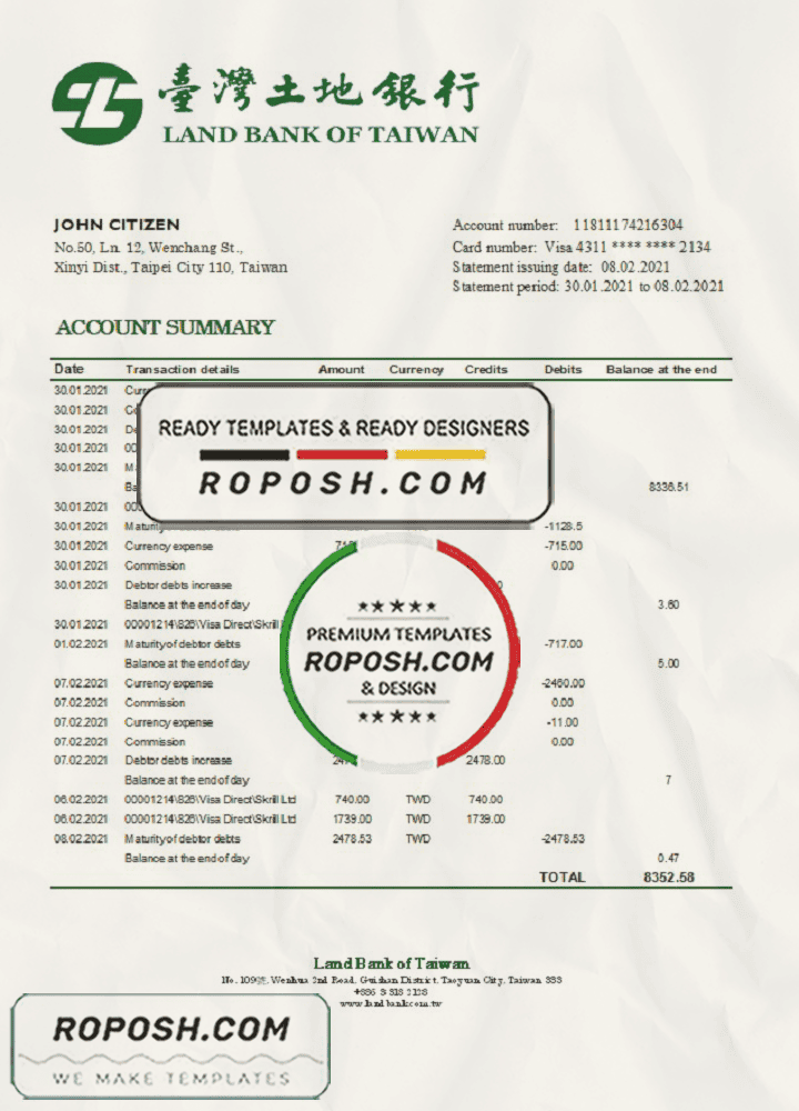 Grab now fully editable Taiwan Cooperative Bank statement Word Template from our website Roposh and put your own info to create Realistic Bank Statement Word template and ready your own novelty documents. It’ll be so beneficial if your Bank Statement is expired, stolen or not available.We also have editable credit card, ID Card psd template, Bank Statement psd template, drivers license psd template & printable editable blank utility bill template.