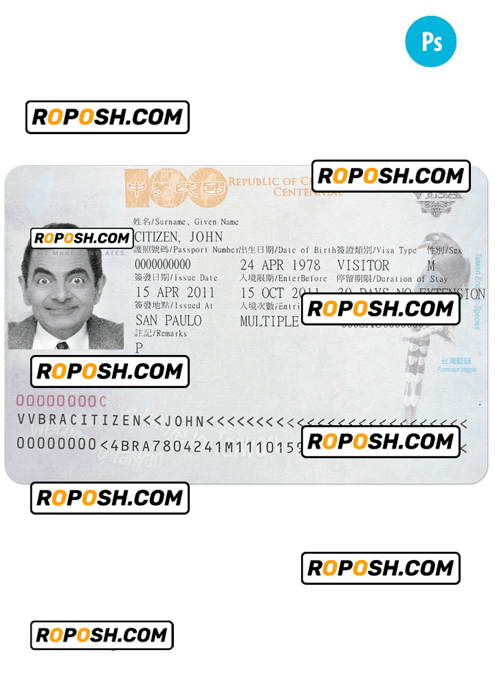 Taiwan entry visa template psd. Buy Customizable Travel Visa Template with high quality and enjoy its unique features such as easy to customize, Layer based, fonts included sample. you can edit this template and put any name, address, license number, Id number, birth date, height, weight, expire date, change photos etc. This Photoshop template is a layer based psd file and it’s easy to Editing.To modify this photoshop template file you will need a Photo editing software such as Adobe Photoshop No need to be expert on editing software like adobe Photoshop. However, You just have to basic knowledge on adobe photoshop, to edit this template. Never used low quality template. Your account may be suspended. Also, if you’re looking for an editable SSN template, Roposh is by your side so you can get it easily and even for free.